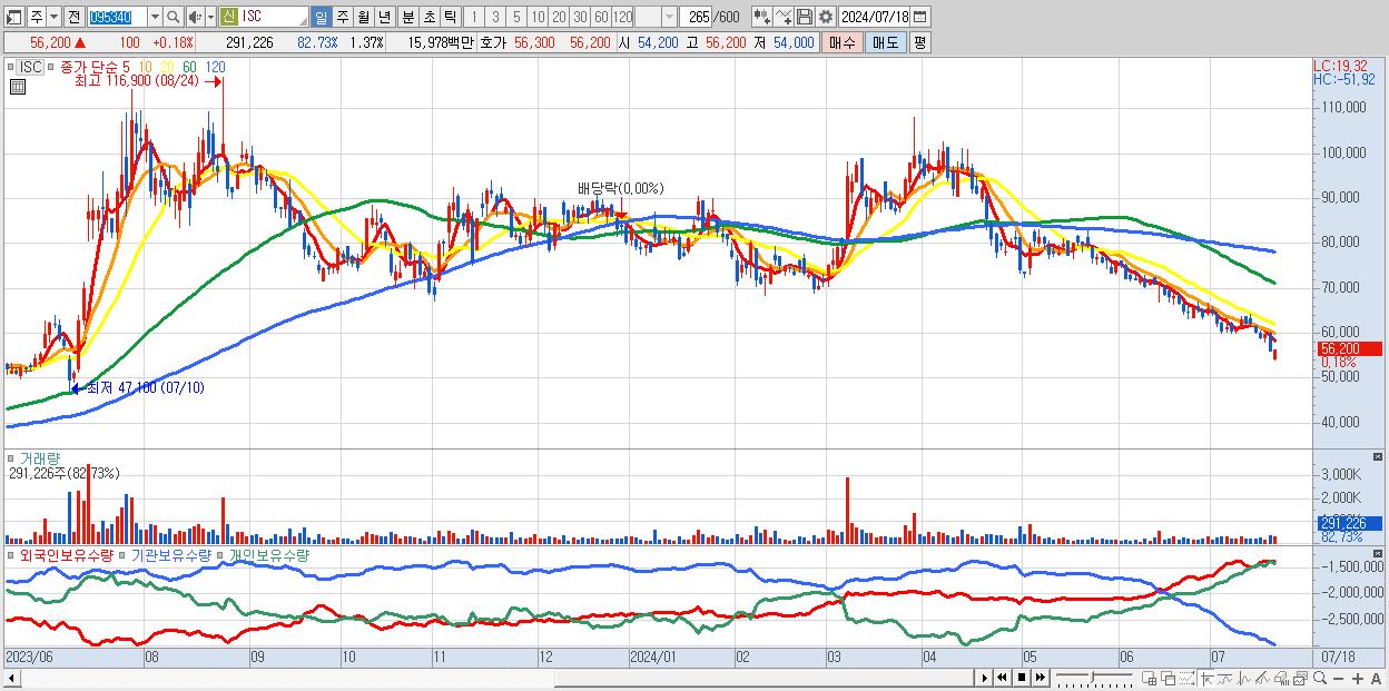 - ISC (56,200원 ▲ 0.18% , 시총: 11,913억, 외국인 순매수 거래금:71억)