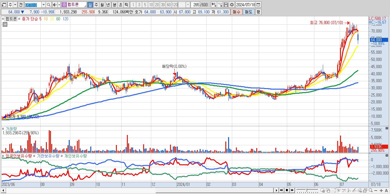 - 펩트론 (64,000원 ▼ -10.99% , 시총: 13,221억, 외국인 순매수 거래금:51억)