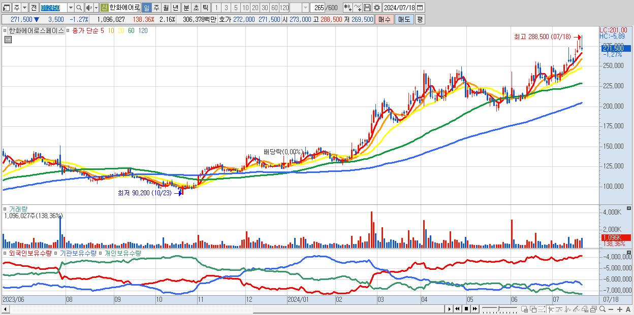 - 한화에어로스페이스 (271,500원 ▼ -1.27% , 시총: 137,460억, 외국인 순매수 거래금:371억)