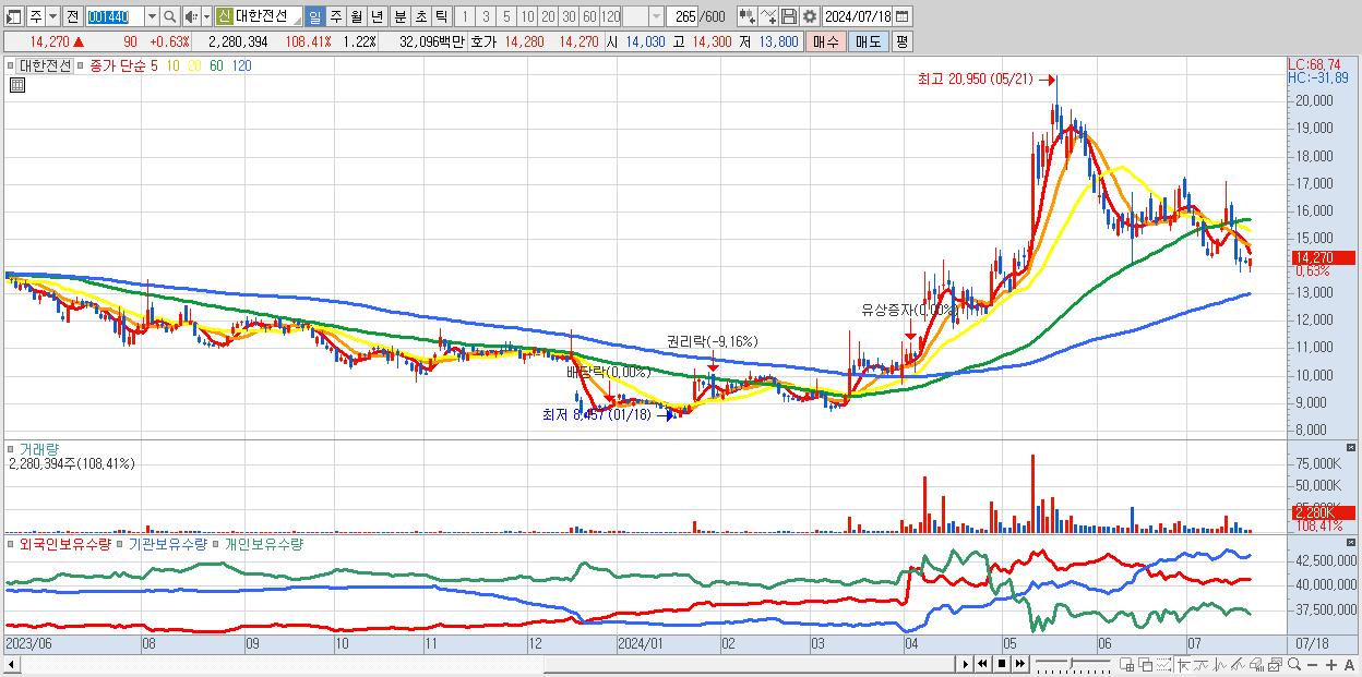30.대한전선 14,270원 ▲ 0.63% (KOSPI, 001440)