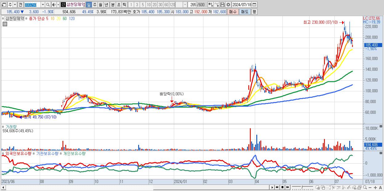 - 삼천당제약 (185,400원 ▼ -1.9% , 시총: 43,490억, 외국인 순매수 거래금:109억)