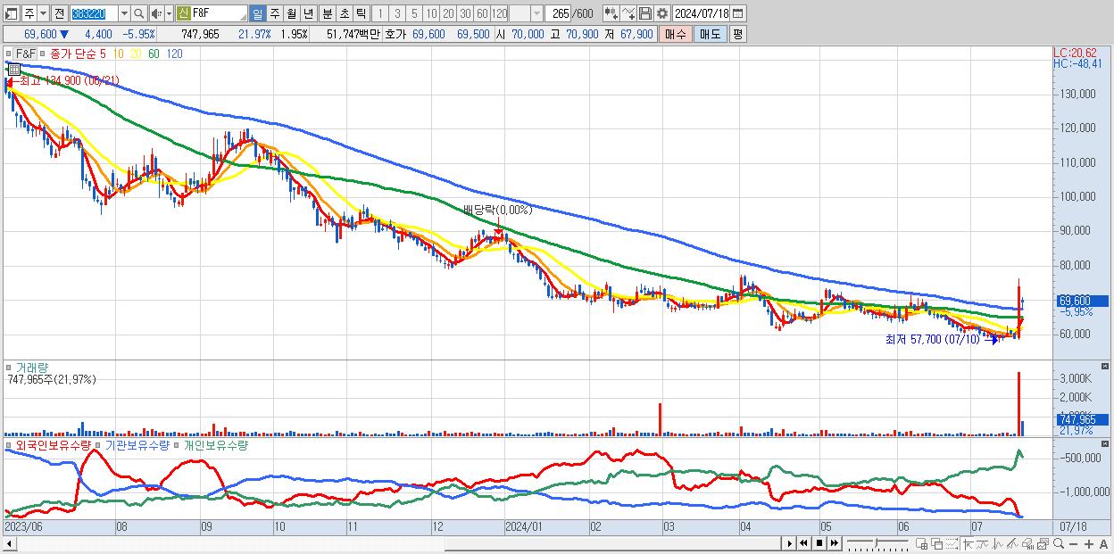 - F&F (69,600원 ▼ -5.95% , 시총: 26,662억, 외국인 순매수 거래금:75억)