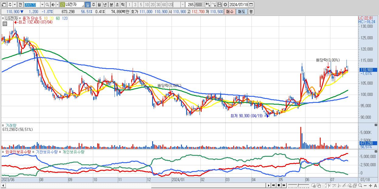 - LG전자 (110,900원 ▼ -1.07% , 시총: 181,485억, 외국인 순매수 거래금:175억)