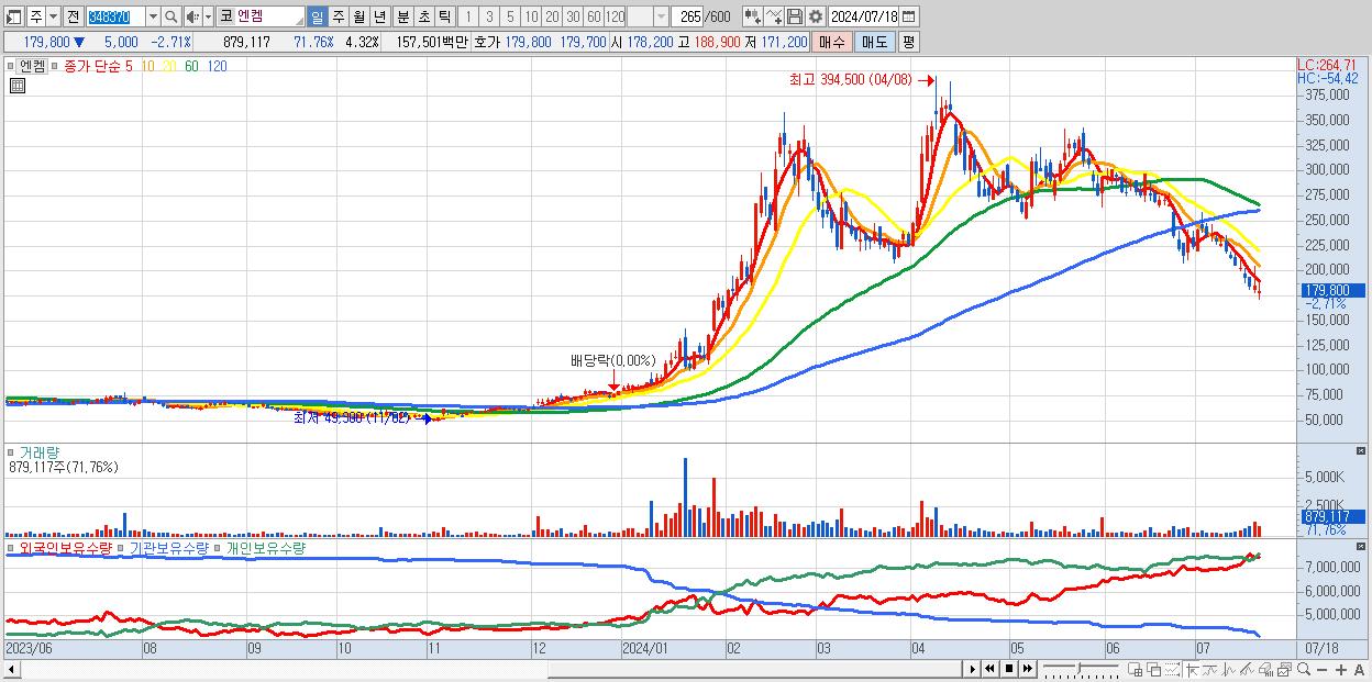 - 엔켐 (179,800원 ▼ -2.71% , 시총: 36,554억, 외국인 순매수 거래금:95억)