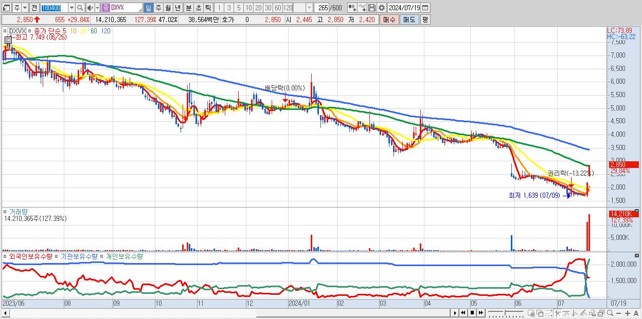 - DXVX (2,850원 ▲ 29.84% , 시총: 861억, 거래량: 14,210,365, 거래대금:386억)