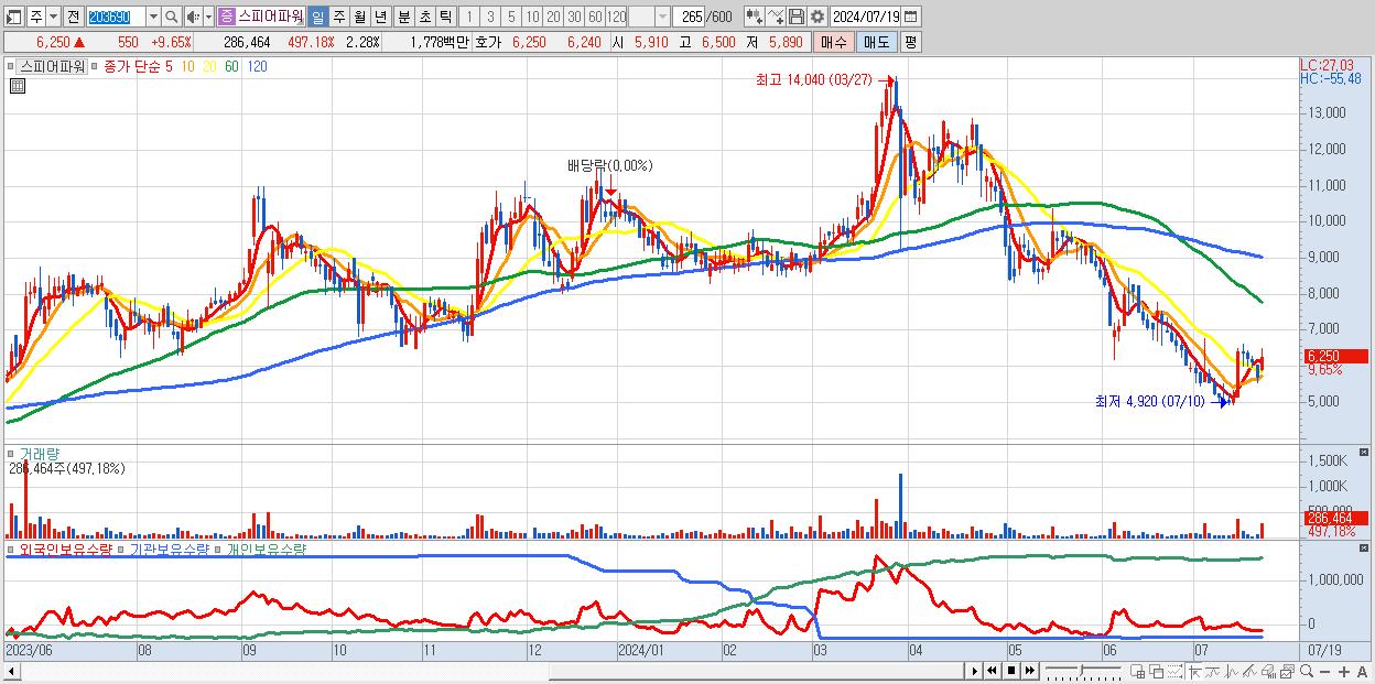 - 스피어파워 (6,250원 ▲ 9.65% , 시총: 785억, 거래량: 286,464, 거래대금:18억)