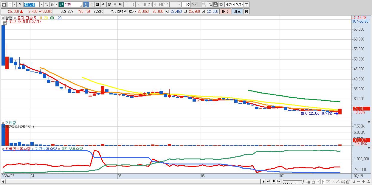 - 삼현 (25,050원 ▲ 10.6% , 시총: 2,648억, 거래량: 309,267, 거래대금:76억)