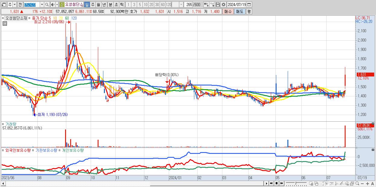 - 오성첨단소재 (1,631원 ▲ 12.1% , 시총: 1,376억, 거래량: 57,852,857, 거래대금:929억)