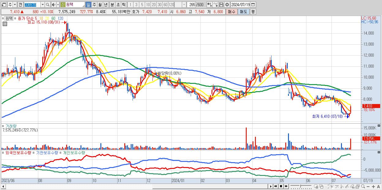 - 원텍 (7,410원 ▲ 10.1% , 시총: 6,620억, 거래량: 7,575,249, 거래대금:552억)