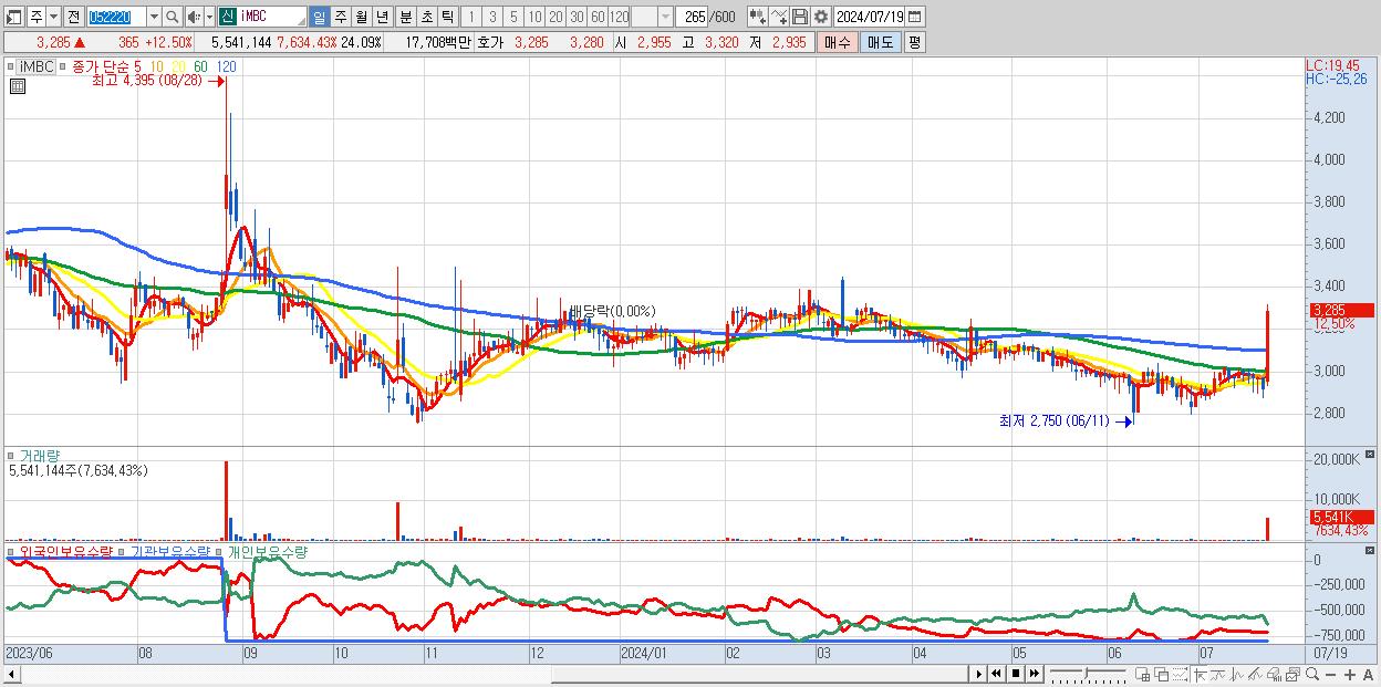 - iMBC (3,285원 ▲ 12.5% , 시총: 756억, 거래량: 5,541,144, 거래대금:177억)