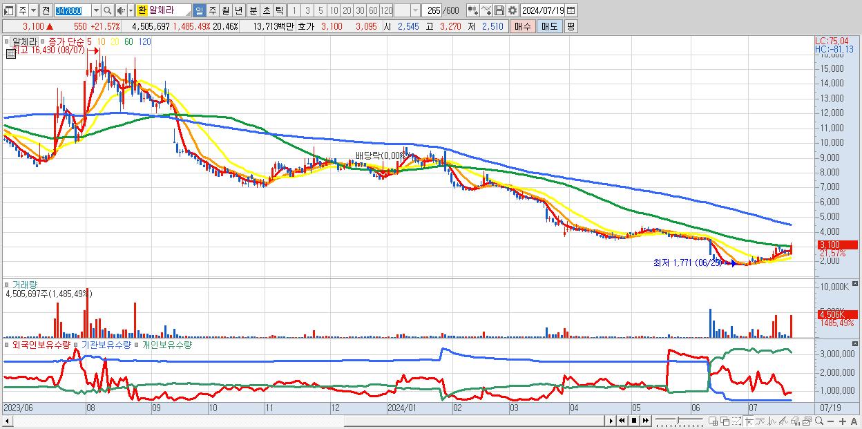 - 알체라 (3,100원 ▲ 21.57% , 시총: 683억, 거래량: 4,505,697, 거래대금:137억)