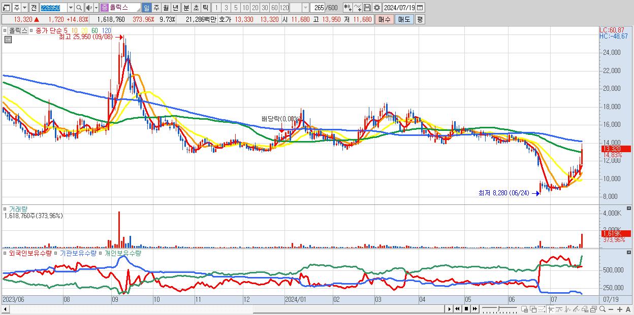 - 올릭스 (13,320원 ▲ 14.83% , 시총: 2,216억, 거래량: 1,618,760, 거래대금:213억)