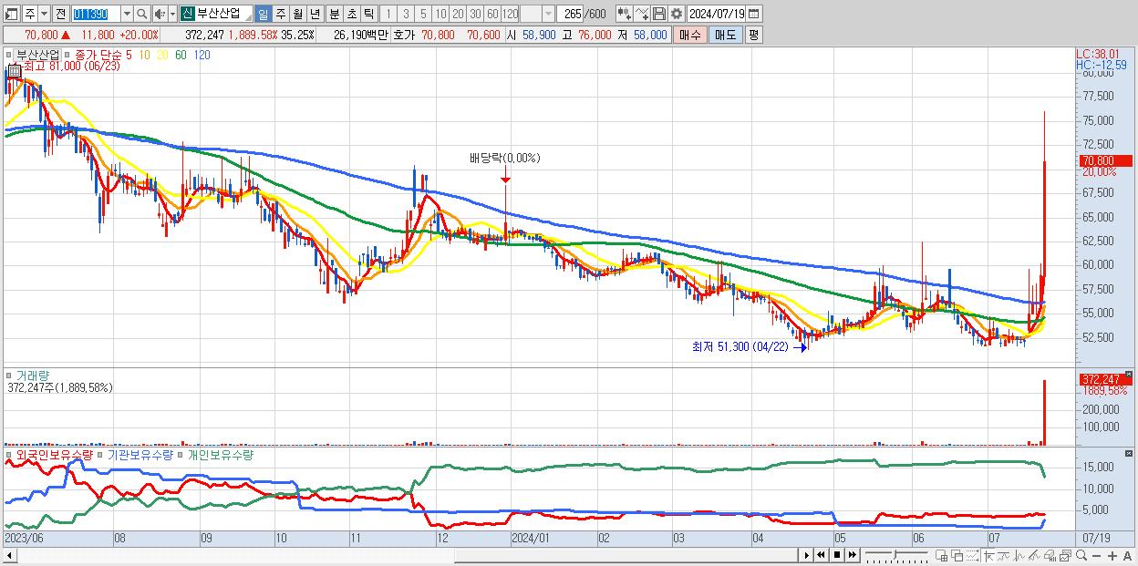 - 부산산업 (70,800원 ▲ 20% , 시총: 748억, 거래량: 372,247, 거래대금:262억)