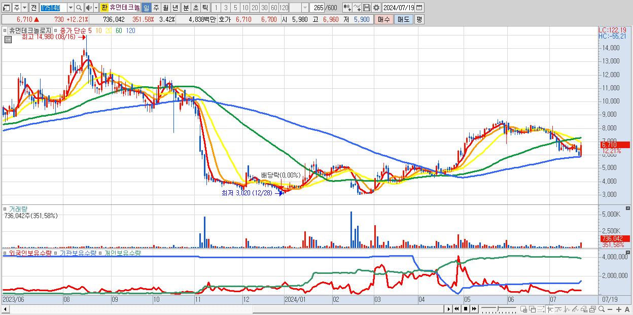 - 휴먼테크놀로지 (6,710원 ▲ 12.21% , 시총: 1,444억, 거래량: 736,042, 거래대금:48억)