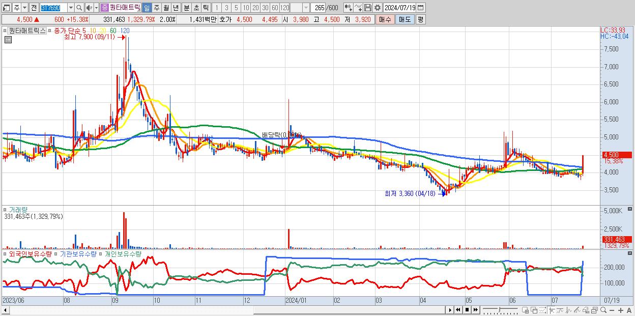 - 퀀타매트릭스 (4,500원 ▲ 15.38% , 시총: 744억, 거래량: 331,463, 거래대금:14억)