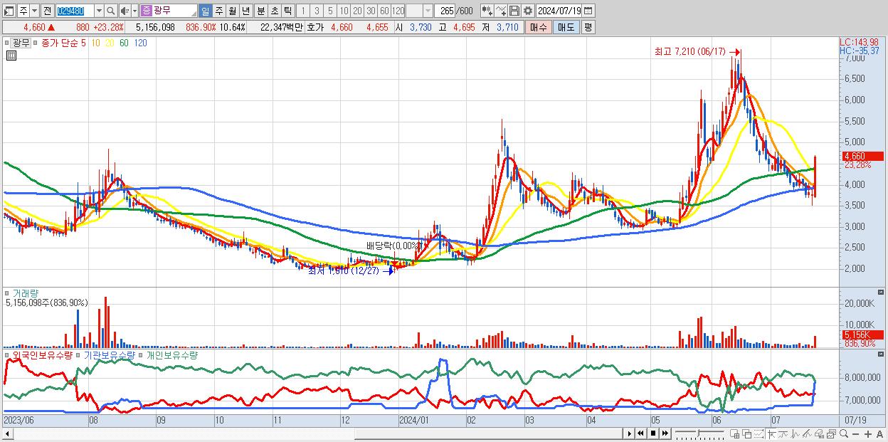- 광무 (4,660원 ▲ 23.28% , 시총: 2,259억, 거래량: 5,156,098, 거래대금:223억)
