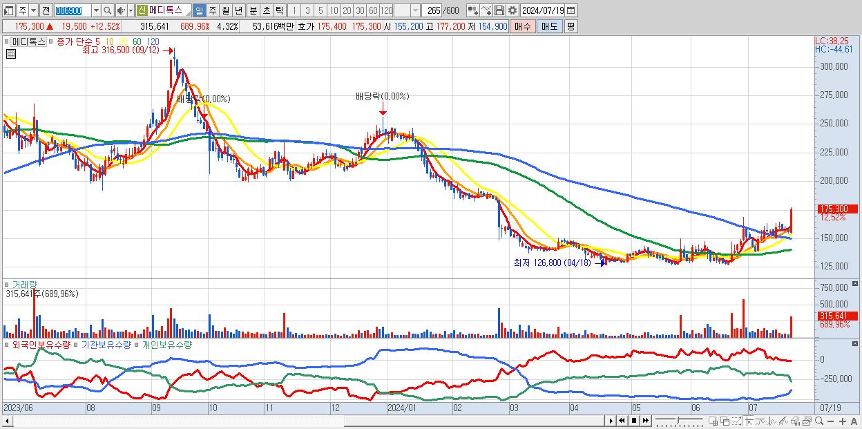- 메디톡스 (175,300원 ▲ 12.52% , 시총: 12,794억, 거래량: 315,641, 거래대금:536억)