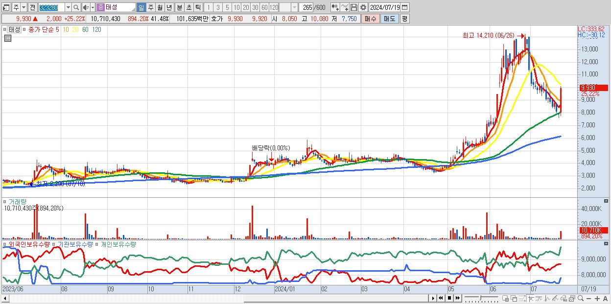 - 태성 (9,930원 ▲ 25.22% , 시총: 2,564억, 거래량: 10,710,430, 거래대금:1,016억)