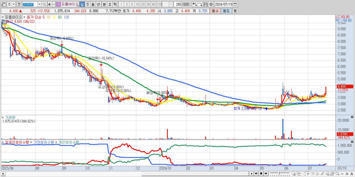 - 피플바이오 (4,400원 ▲ 13.55% , 시총: 928억, 거래량: 1,875,614, 거래대금:77억)