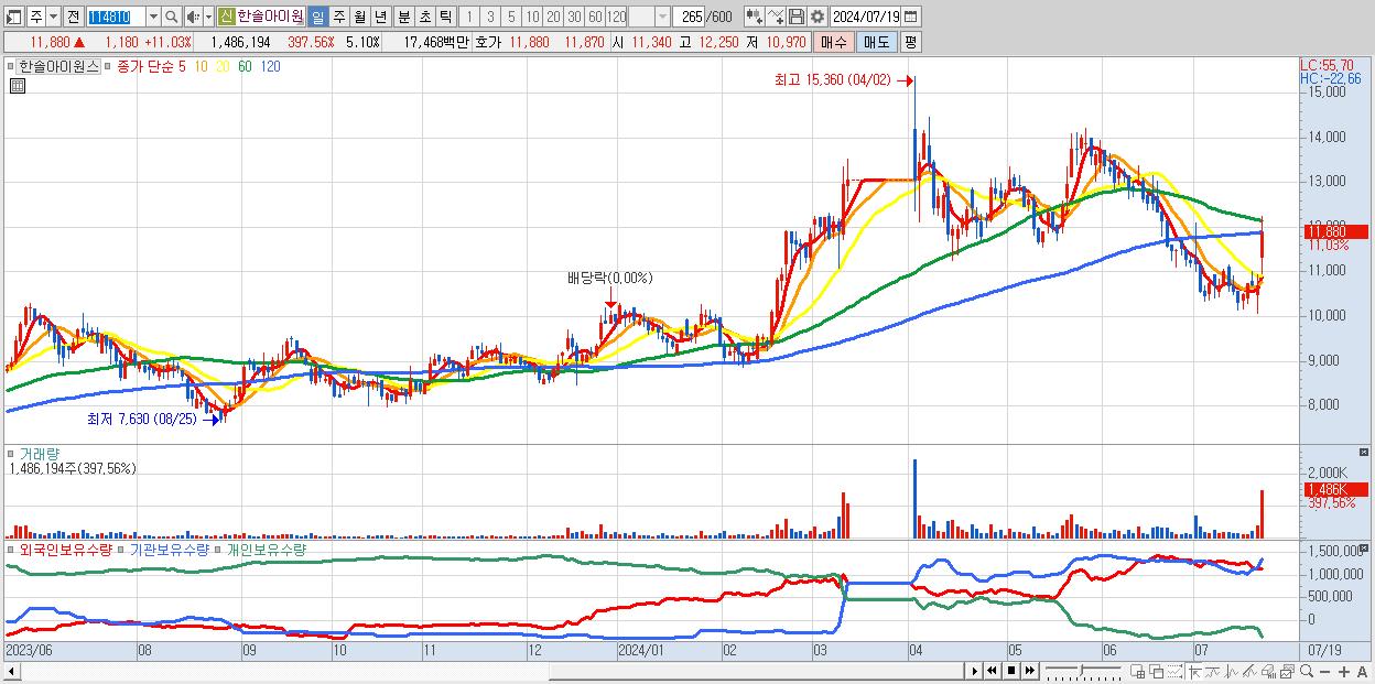 - 한솔아이원스 (11,880원 ▲ 11.03% , 시총: 3,459억, 거래량: 1,486,194, 거래대금:175억)