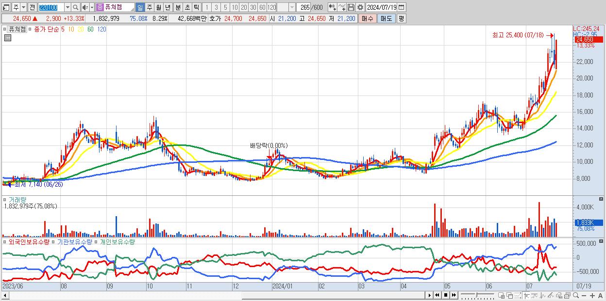 - 퓨쳐켐 (24,650원 ▲ 13.33% , 시총: 5,448억, 거래량: 1,832,979, 거래대금:427억)