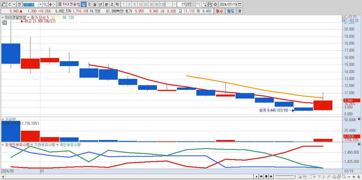 - 하이젠알앤엠 (9,940원 ▲ 16.26% , 시총: 3,070억, 거래량: 6,092,576, 거래대금:620억)