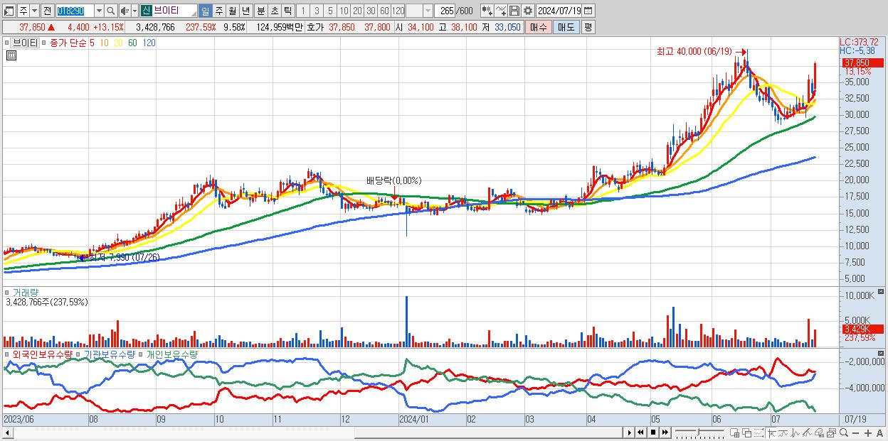 - 브이티 (37,850원 ▲ 13.15% , 시총: 13,550억, 거래량: 3,428,766, 거래대금:1,250억)