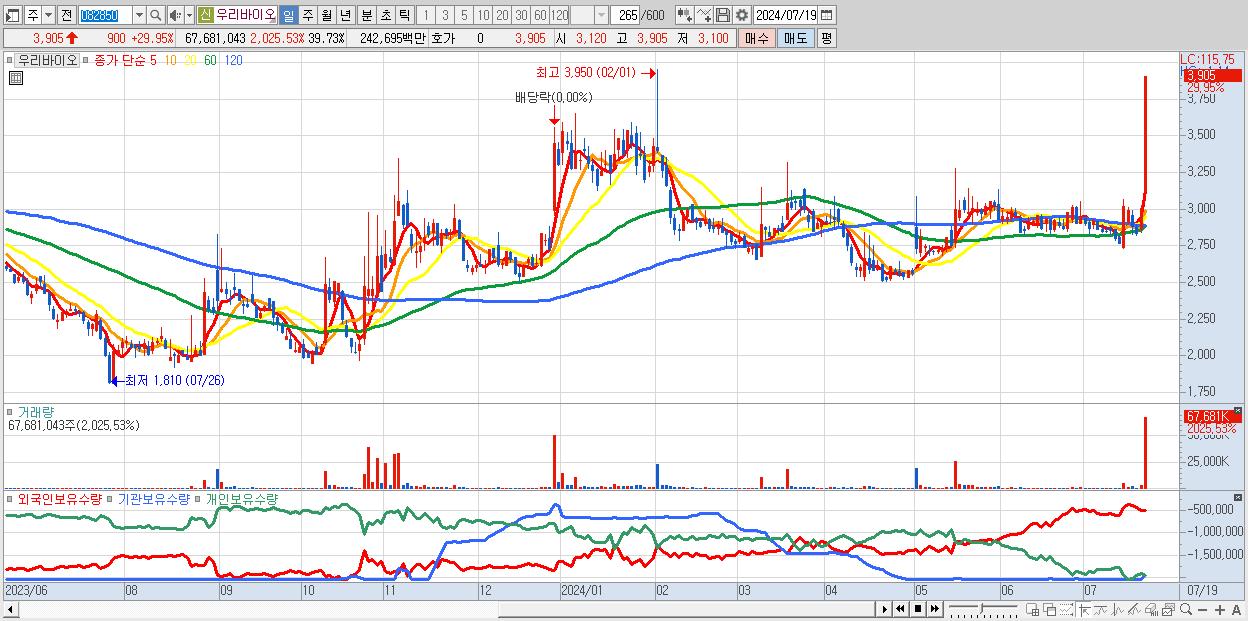 - 우리바이오 (3,905원 ▲ 29.95% , 시총: 1,891억, 거래량: 67,681,043, 거래대금:2,427억)