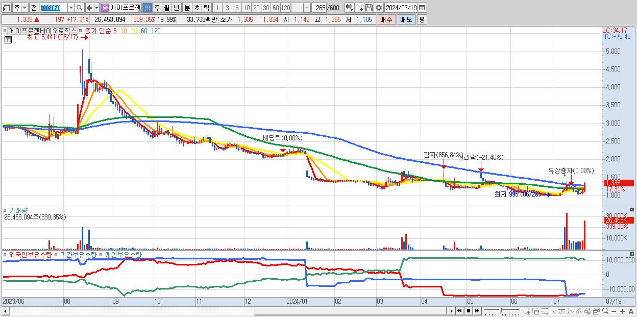 - 에이프로젠바이오로직스 (1,335원 ▲ 17.31% , 시총: 1,767억, 거래량: 26,453,094, 거래대금:337억)