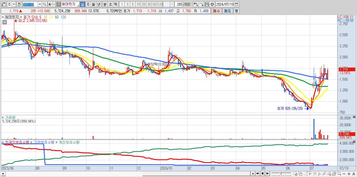 - 애머릿지 (1,719원 ▲ 13.54% , 시총: 725억, 거래량: 5,724,298, 거래대금:97억)