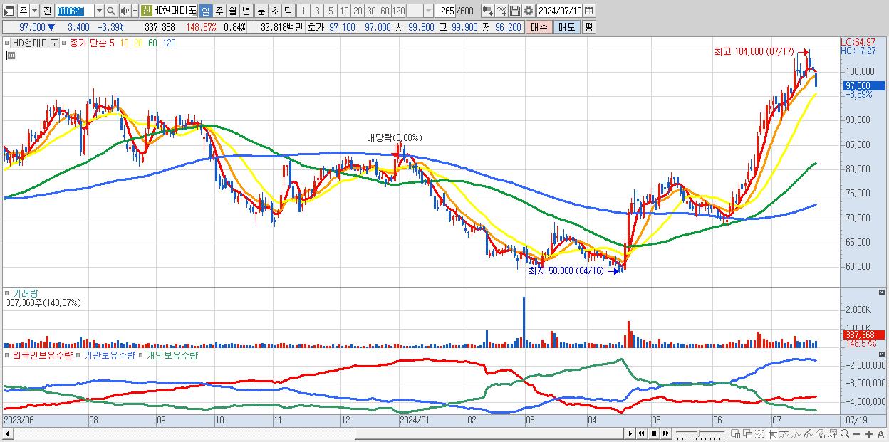 - HD현대미포 (97,000원 ▼ -3.39% , 시총: 38,744억, 외국인 순매수 거래금:87억)