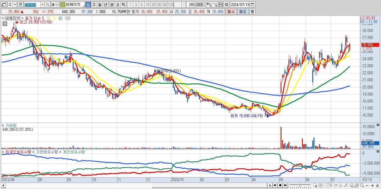 - 비에이치 (25,950원 ▲ 1.37% , 시총: 8,944억, 외국인 순매수 거래금:42억)