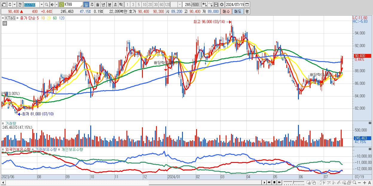 - KT&G (90,400원 ▲ 0.44% , 시총: 117,812억, 외국인 순매수 거래금:97억)