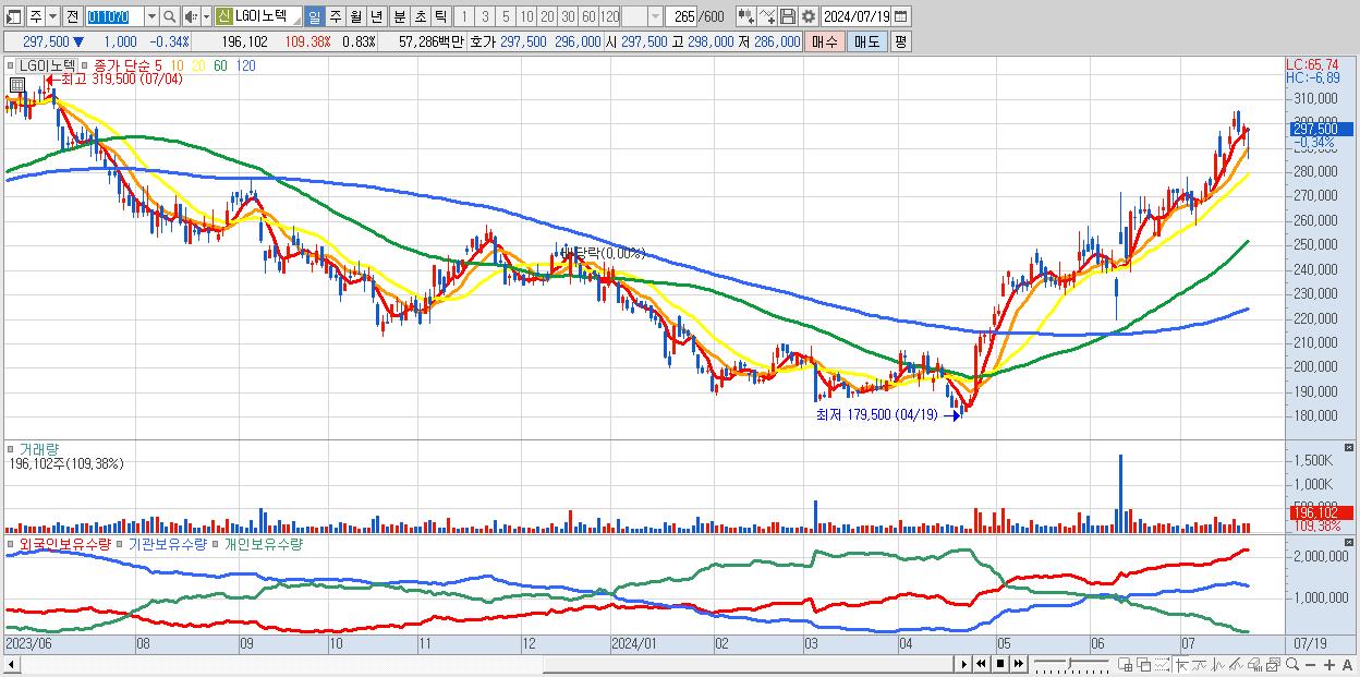 - LG이노텍 (297,500원 ▼ -0.34% , 시총: 70,410억, 외국인 순매수 거래금:118억)