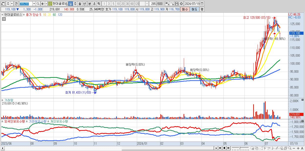 - 현대글로비스 (119,100원 ▼ -1.08% , 시총: 44,663억, 외국인 순매수 거래금:52억)