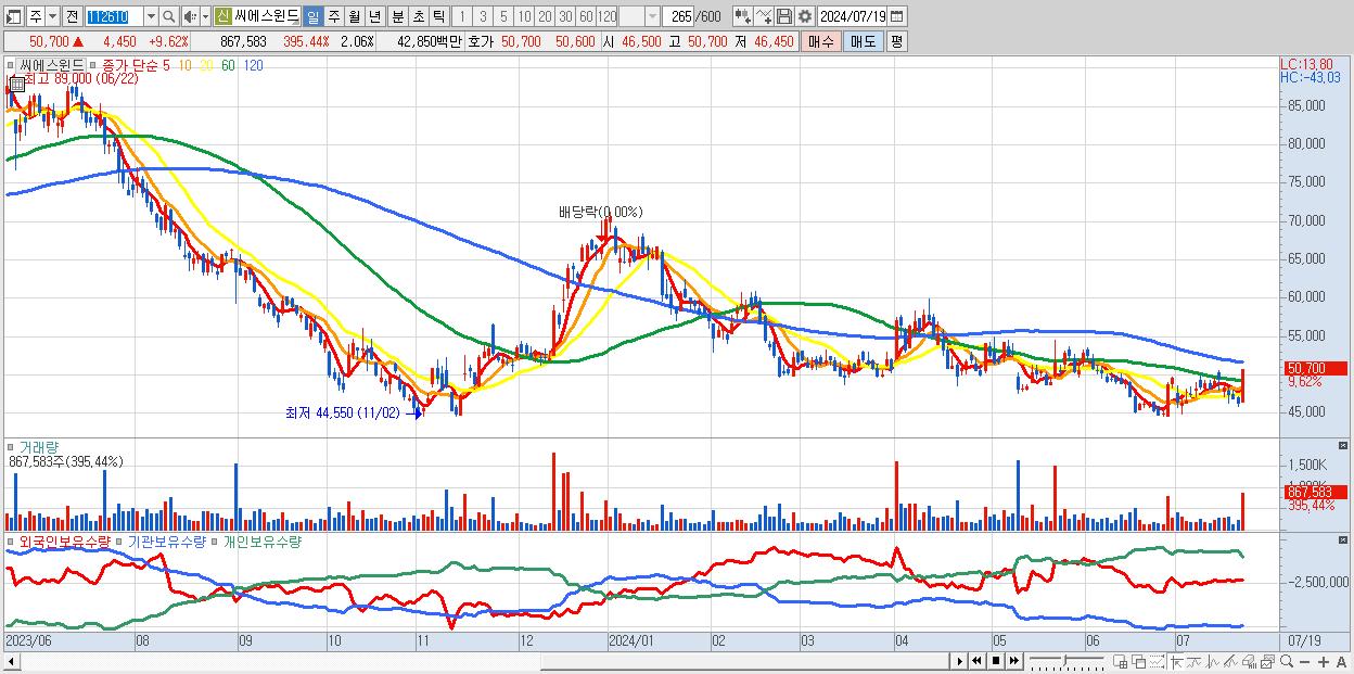 - 씨에스윈드 (50,700원 ▲ 9.62% , 시총: 21,381억, 외국인 순매수 거래금:155억)