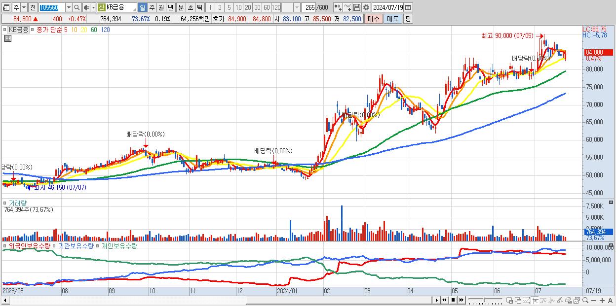 - KB금융 (84,800원 ▲ 0.47% , 시총: 342,177억, 외국인 순매수 거래금:89억)