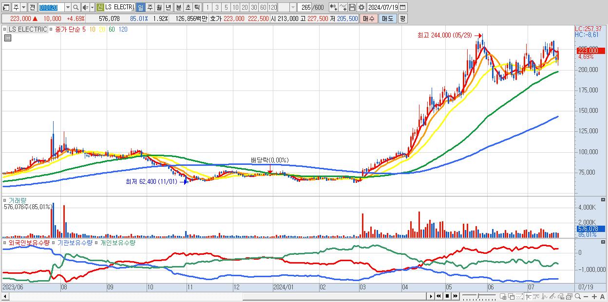 - LS ELECTRIC (223,000원 ▲ 4.69% , 시총: 66,900억, 외국인 순매수 거래금:95억)