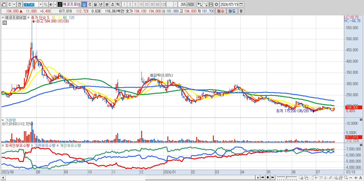 - 에코프로비엠 (194,000원 ▲ 6.48% , 시총: 189,735억, 외국인 순매수 거래금:190억)