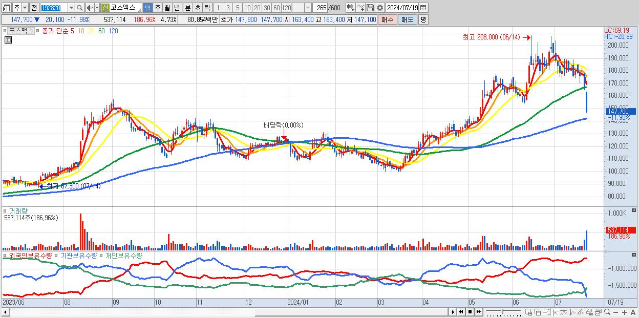 - 코스맥스 (147,700원 ▼ -11.98% , 시총: 16,763억, 외국인 순매수 거래금:108억)