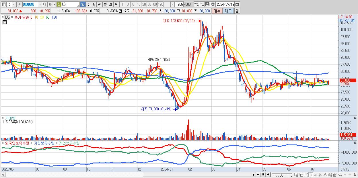 - LG (81,800원 ▲ 0.99% , 시총: 128,672억, 외국인 순매수 거래금:51억)