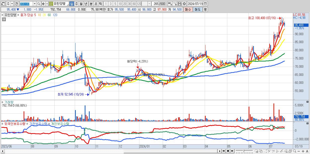- 유한양행 (95,400원 ▼ -1.95% , 시총: 76,519억, 외국인 순매수 거래금:82억)
