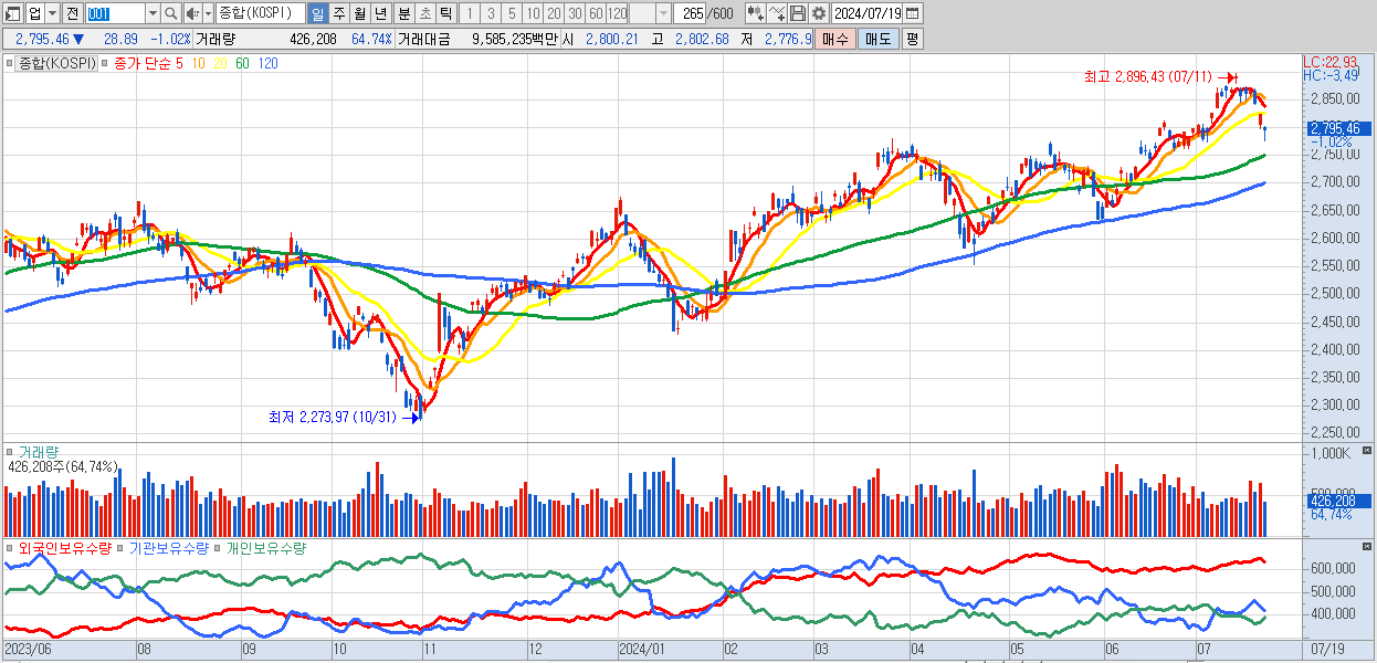 | 07/19 | 2,795.46 | ▼-1.02% | 7,848억 | -4,229억 | -3,639억 | 20억 |