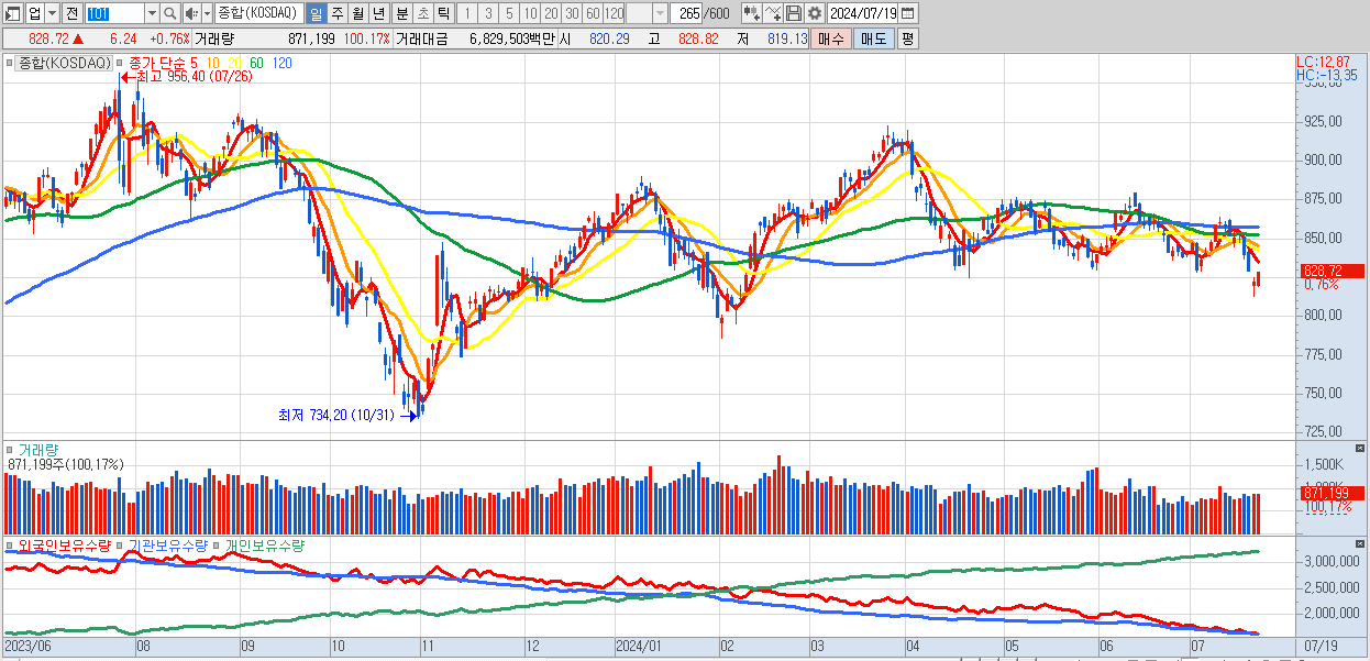 | 07/19 | 828.72 | ▲0.76% | -225억 | -312억 | 650억 | -113억 |