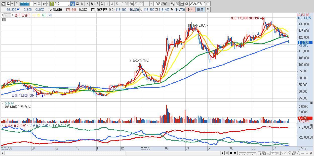 - 기아 (116,300원 ▼ -3% , 시총: 465,035억, 거래량: 1,498,610, 거래대금:1,749억)