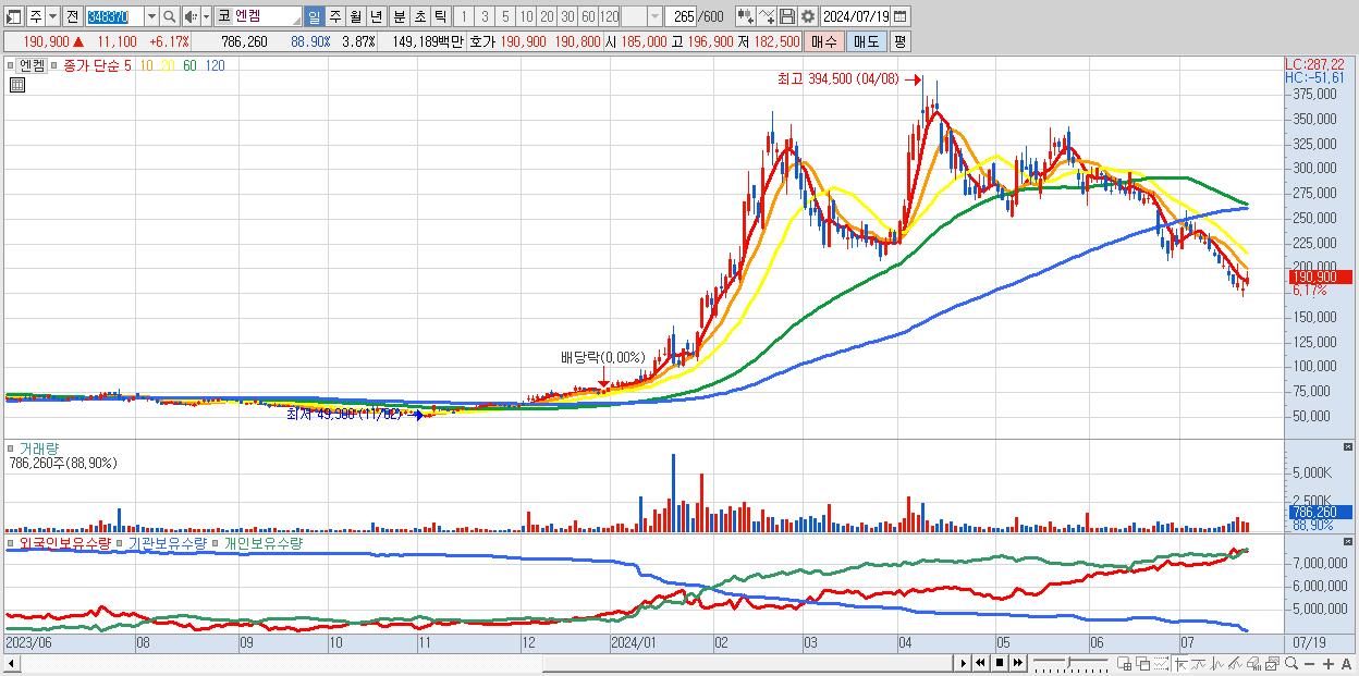 - 엔켐 (190,900원 ▲ 6.17% , 시총: 38,811억, 거래량: 786,260, 거래대금:1,492억)