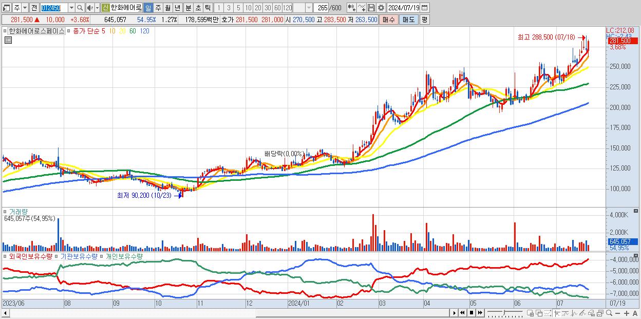 - 한화에어로스페이스 (281,500원 ▲ 3.68% , 시총: 142,523억, 거래량: 645,057, 거래대금:1,786억)