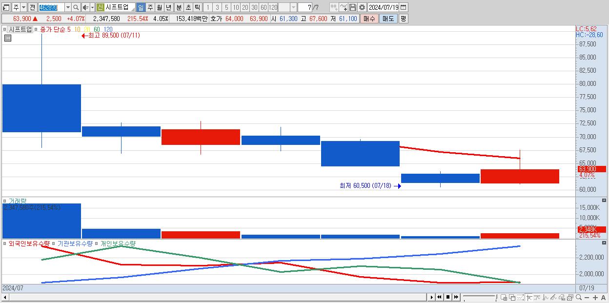 - 시프트업 (63,900원 ▲ 4.07% , 시총: 37,078억, 거래량: 2,347,580, 거래대금:1,534억)