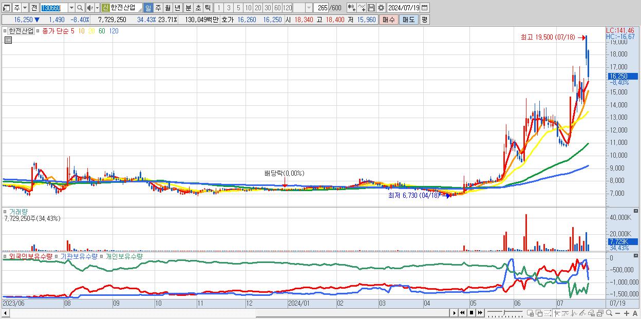 - 한전산업 (16,250원 ▼ -8.4% , 시총: 5,298억, 거래량: 7,729,250, 거래대금:1,300억)