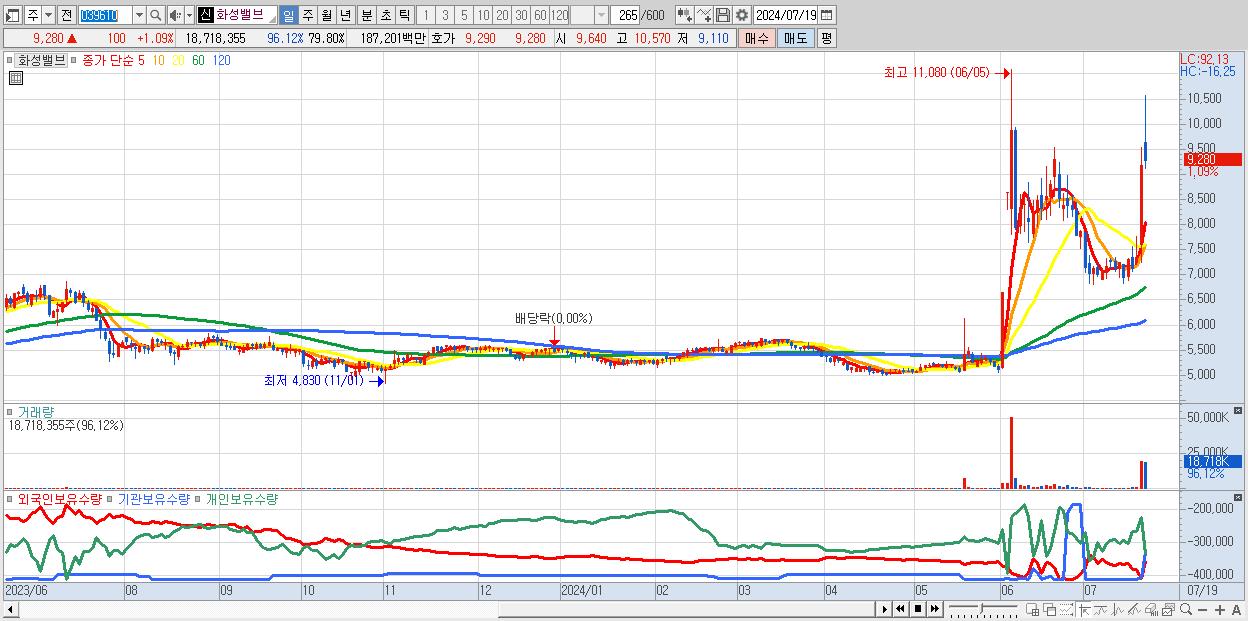 - 화성밸브 (9,280원 ▲ 1.09% , 시총: 966억, 거래량: 18,718,355, 거래대금:1,872억)